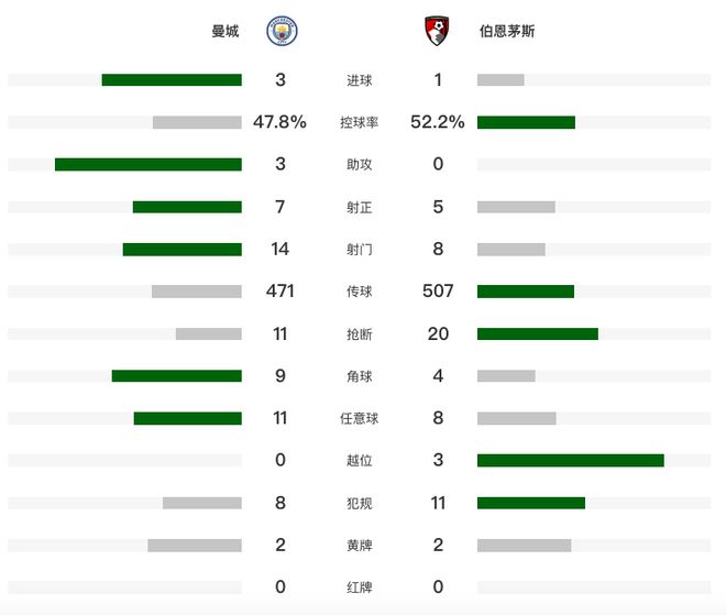在北京时间11月3日凌晨结束的英超第10轮一场焦点战中,曼城在主场3-1完胜伯恩茅斯。上半场,哈兰德双响,谢尔基2助,泰勒-亚当斯破门。下半场,奥莱利为曼城锁定胜局。