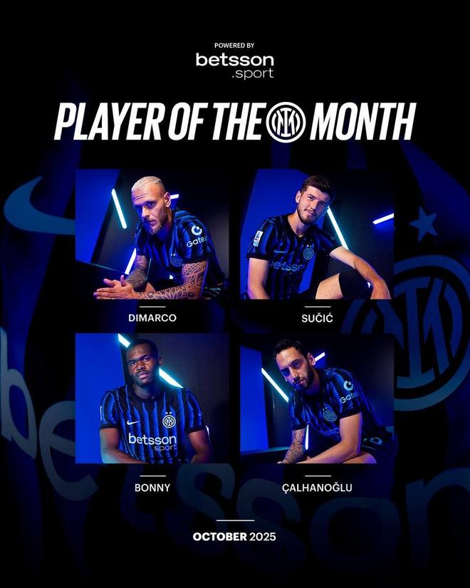 国际米兰官方公布了10月队内最佳球员候选名单,恰尔汗奥卢领衔,迪马尔科、博尼、苏契奇在列。